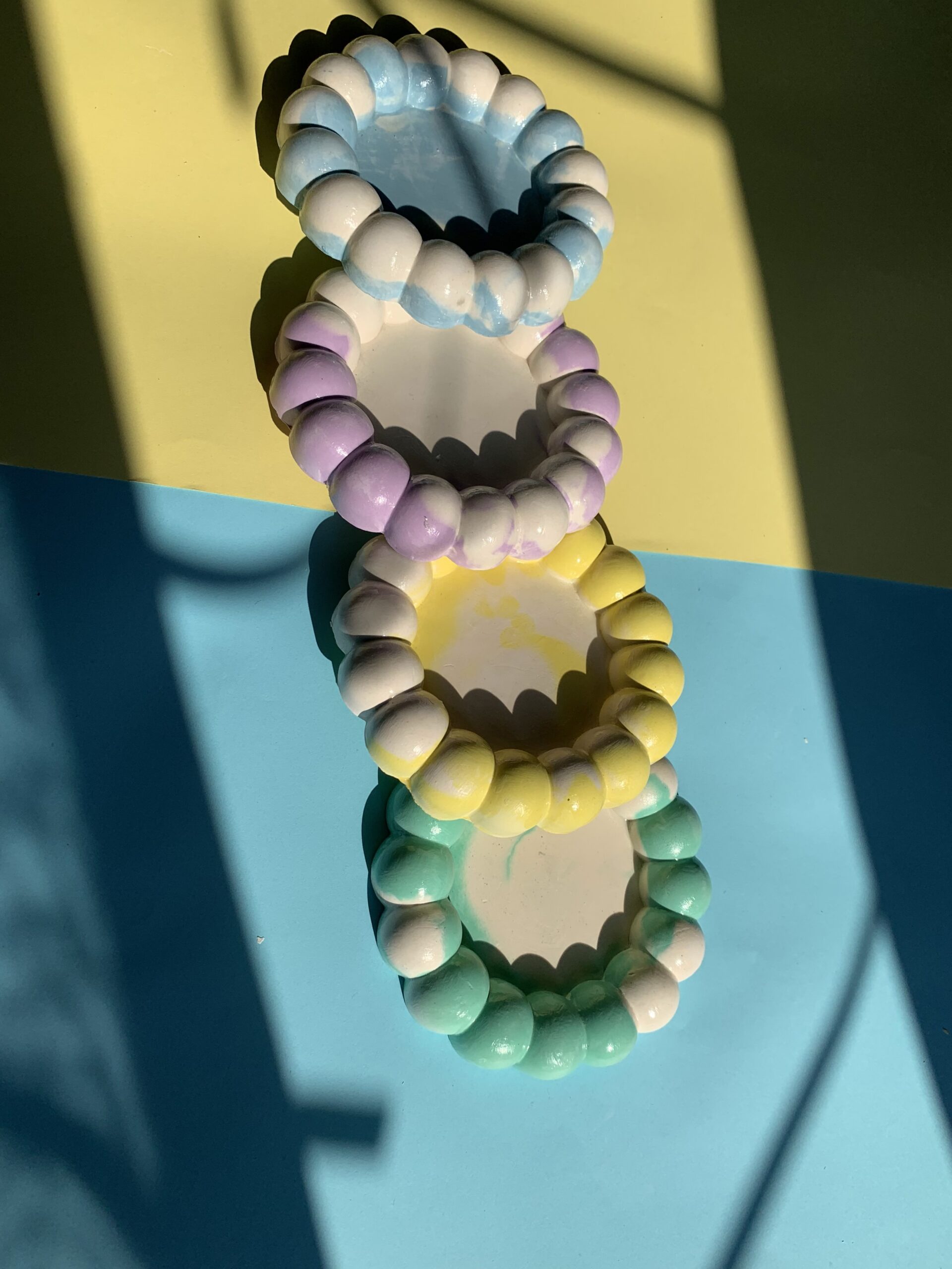 Handcrafted Ceramic Decor Add a playful yet sophisticated touch to your space with these uniquely designed Pastel Bubble Trays. Featuring a modern “bubble” or “cloud” rim, these versatile trays are the perfect blend of contemporary trend and functional art.