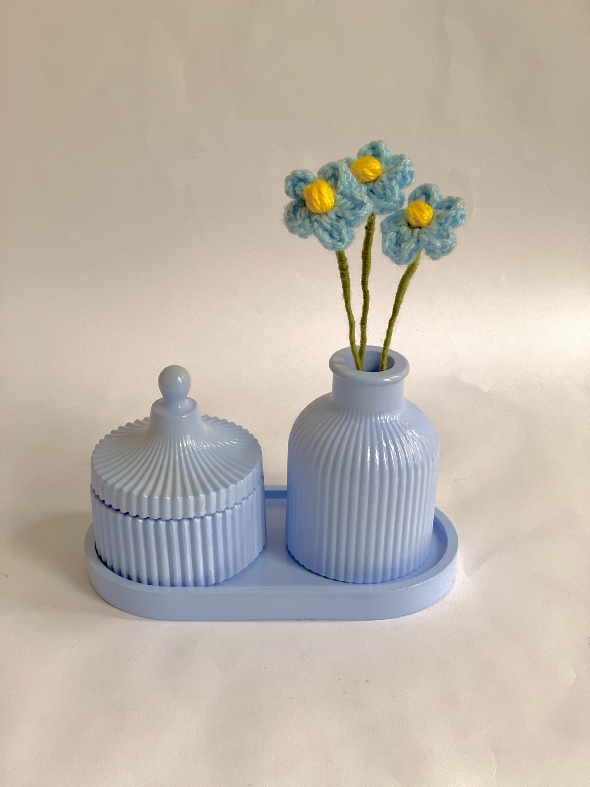 Add a touch of playful elegance to your vanity with this Handcrafted Blue Ribbed Vanity Set. This coordinated collection features a textured, glossy blue finish that brings warmth and a modern aesthetic to any room.