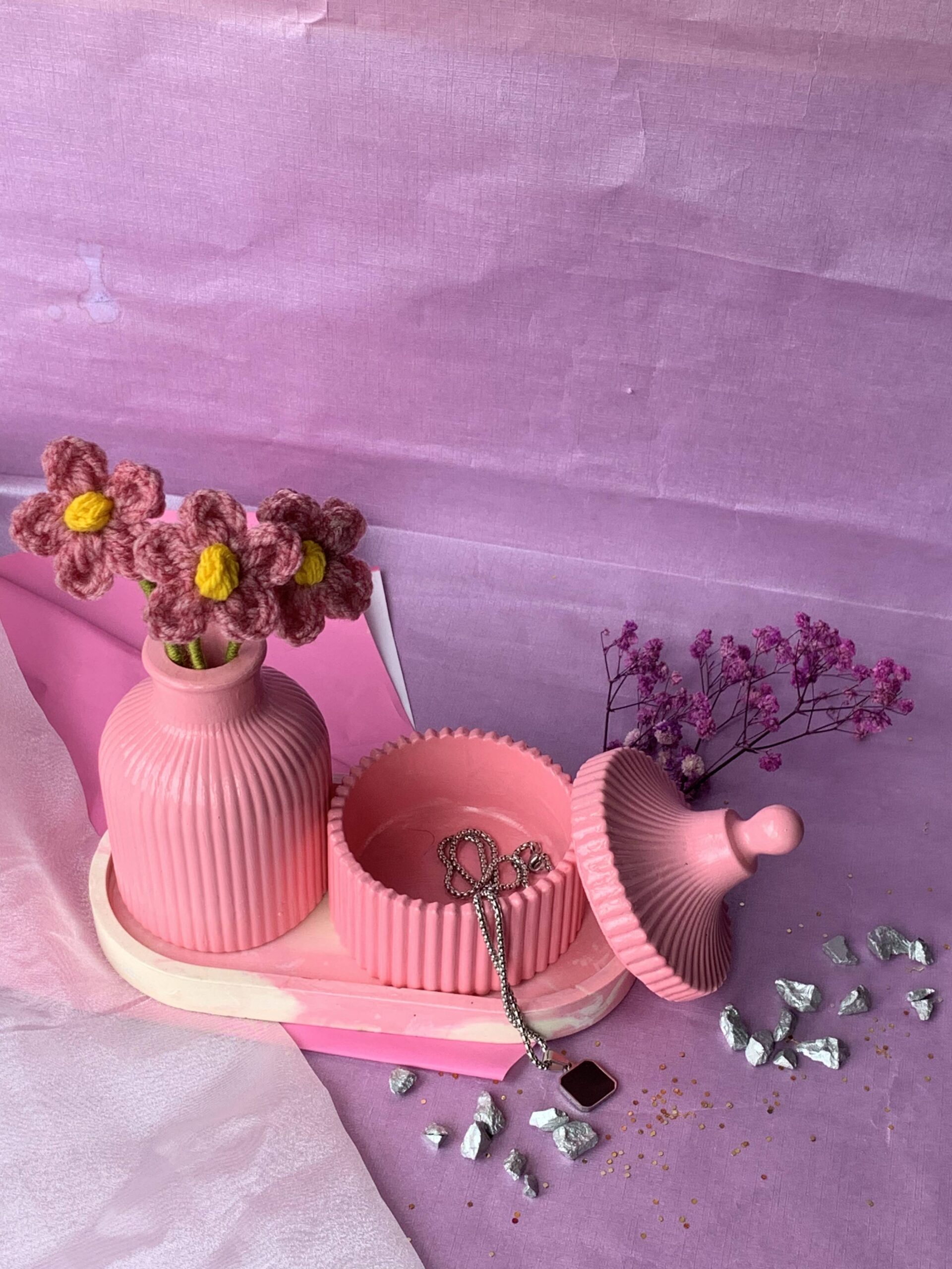 Add a touch of playful elegance to your vanity with this Handcrafted Pink Ribbed Vanity Set. This coordinated collection features a textured, matte pink finish that brings warmth and a modern aesthetic to any room.